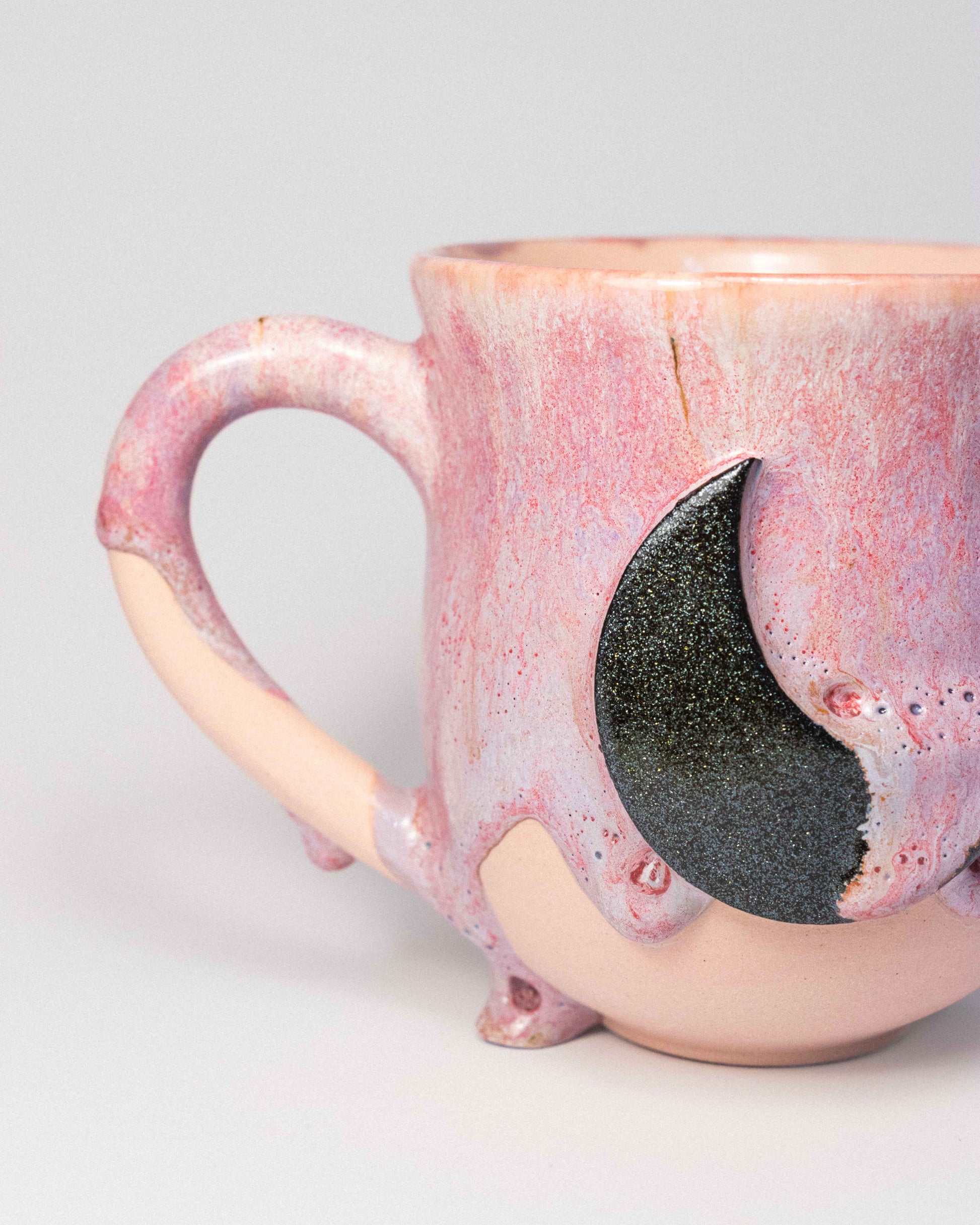 This mug was handmade with pink clay and glazed with drippy pastel glazes. It features a big black glittery moon and a big handle.
