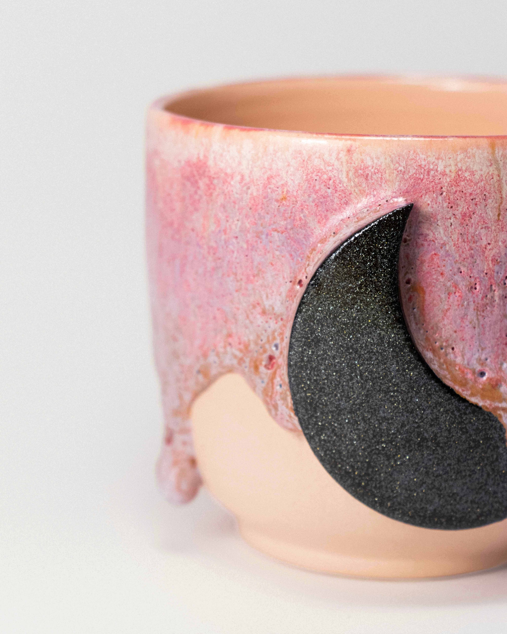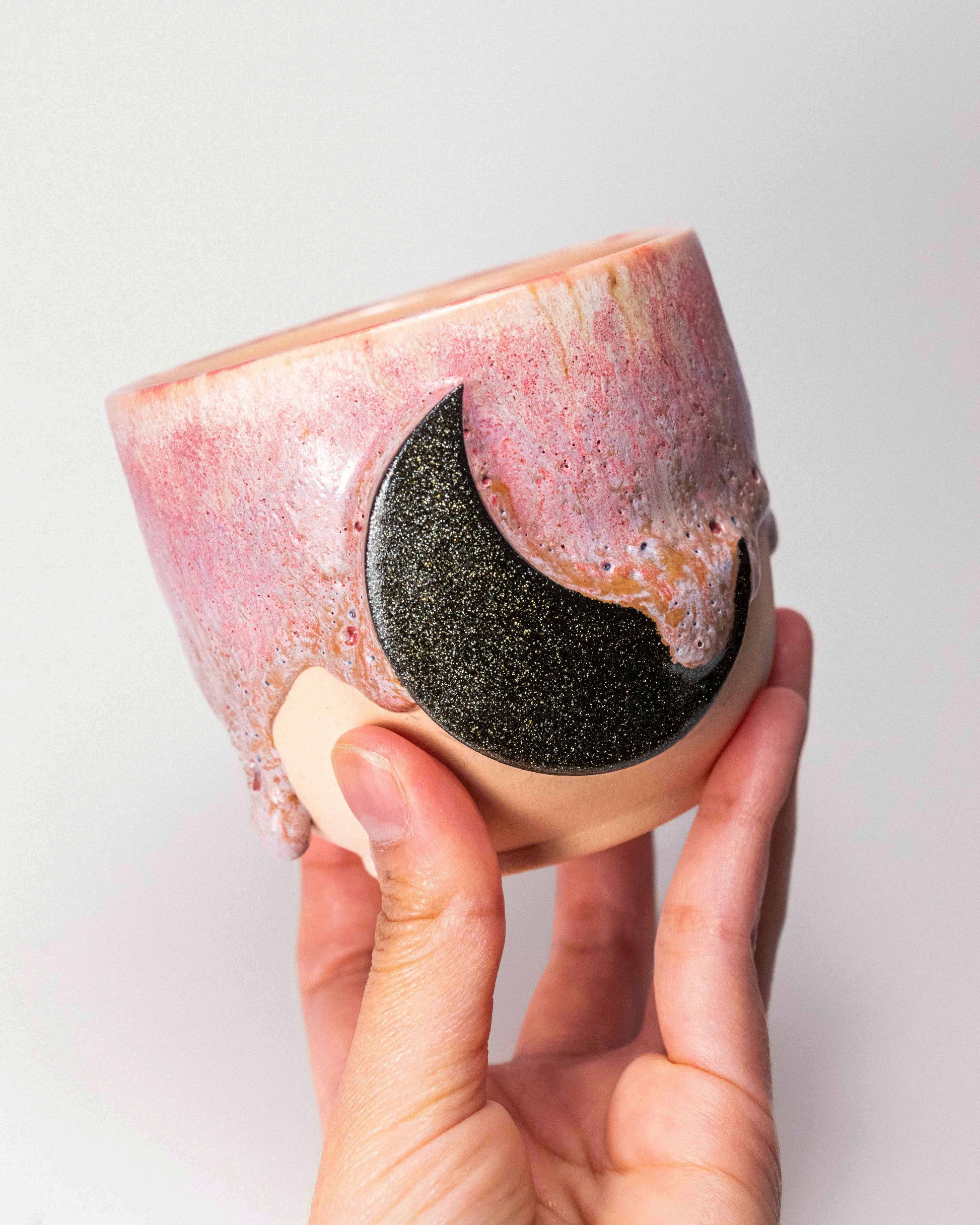 This cup was handmade with pink clay and glazed with drippy pastel glazes. It features a big black glittery moon on one side.